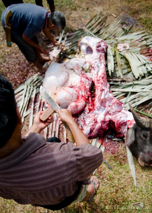 I try to avoid casting western-biased judgements upon traditional beliefs and practises, unless they’re inflicting serious suffering on the earth or other living creatures. In this Toraja tradition, no parts of any of the animals are wasted — the meat is given to friends, relatives, attending families, local churches, and preserved to be eaten the rest of the year. The butchers are trained professionals (though one cowboy killer tried to hold the buffalo by its nose instead of tying it up before slitting its throat; the beast nearly bowled over ten of us in the ensuing chaos). Only two of the twenty slaughtered buffalo I witnessed (and dodged) at the funeral took more than two minutes to die; and all of them lived extremely well in the years prior, compared to how we treat our livestock. The Torajans are both more connected to, and (likely as a result) less wasteful with, the animals they kill.