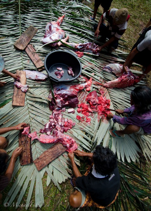 We arrived in the village early. Four men were dismantling a buffalo, peeling it’s skin like an orange, then hacking off its hooves for the children to play with (before taking them to home for soup). The men carved out massive meat slabs, and heaved them onto the makeshift butcher shop: Layers of banana leaves placed on the ground, eight men sitting around them in a circle, slicing flesh into reasonable serving sizes on wooden boards with rusty knives.